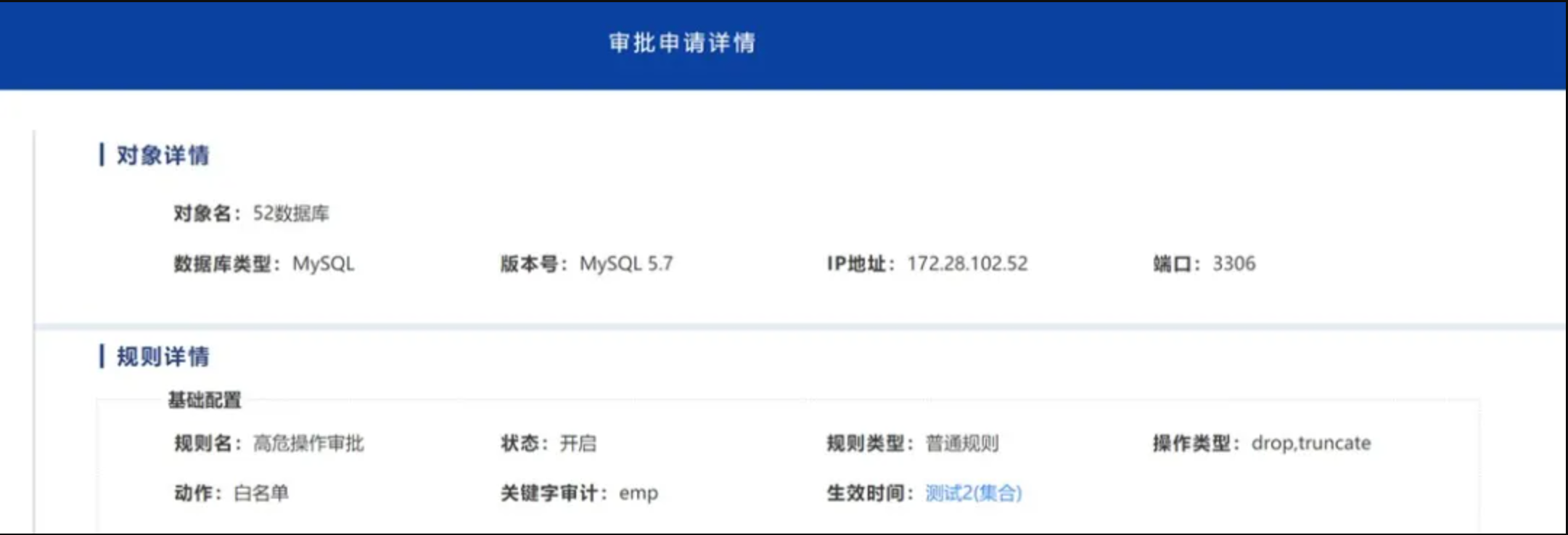 高危操作审批。数据库防火墙集成审批电子流程,也可以与OA系统对接。针对确实需要进行高危操作的运维或开发人员,可在数据库防火墙上提交高危操作的审批的工单,工单审批顺利获得后,操作员可操作工单中的内容,数据库防火墙会在一定时间内放行,顺利获得此功能,可对高危操作进行有效管控,在不影响业务的情况下保障运维安全。